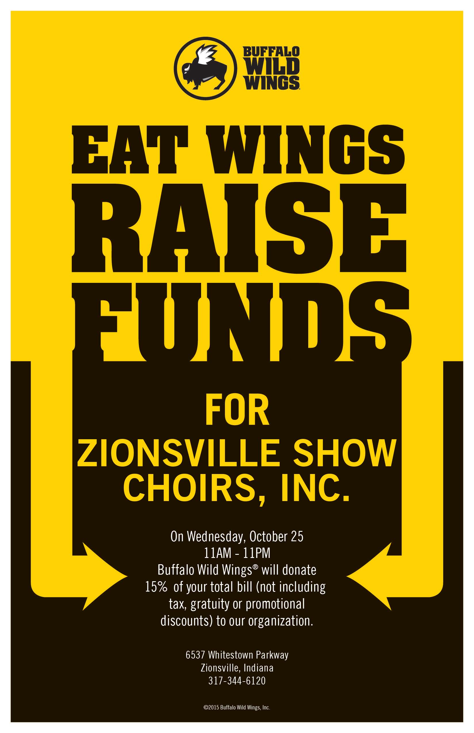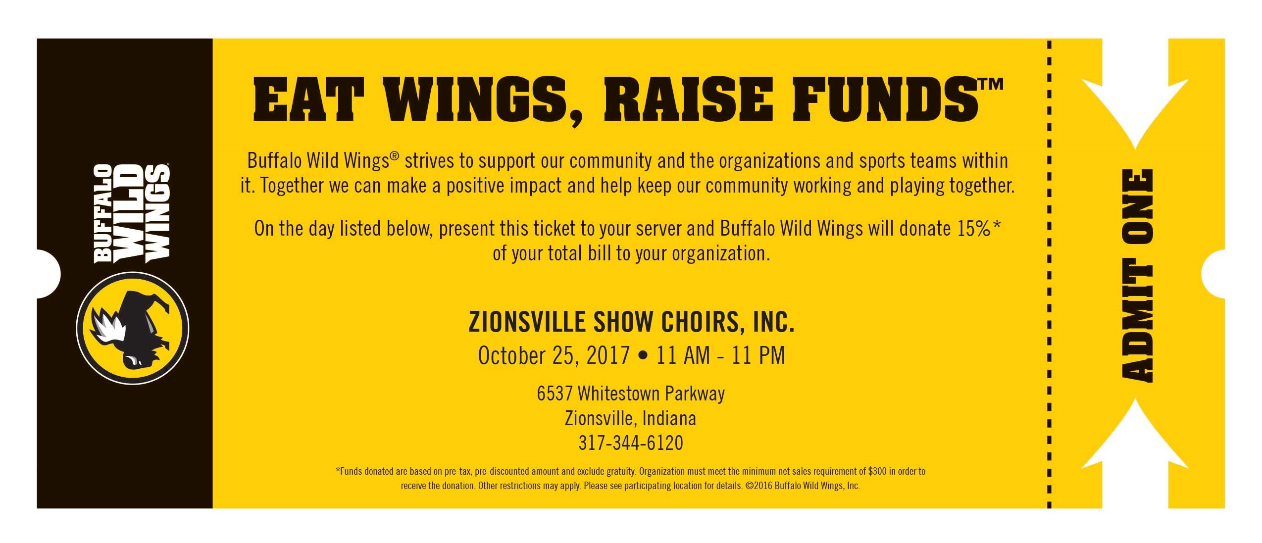 On Wednesday, October 25th from 11:00 AM – 11:00 PM present the ticket listed below (click HERE to print) to your server and Buffalo Wild Wings at 6537 Whitestown Parkway in Zionsville will donate 15% of your total bill (not including tax, gratuity or promotional discounts) to the Zoinsville Show Choirs!